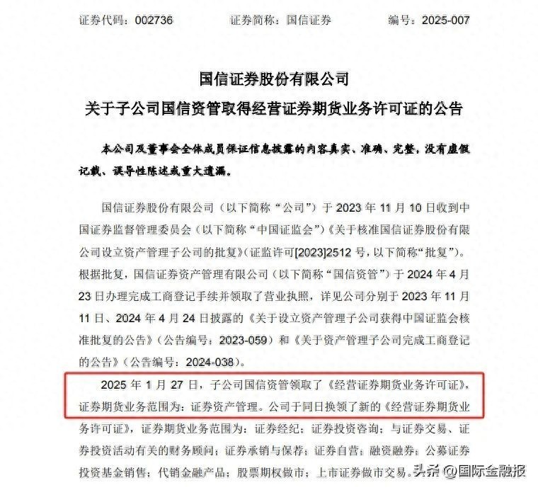 2022年9月,国信证券向证监会递交申请设立资管子公司的申请;2023年11月,证监会下发《关于核准国信证券股份有限公司设立资产管理子公司的批复》;2024年4月,国信资管办理完成工商登记手续并领取营业执照,并在9个月后获得经营证券期货业务许可证。